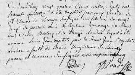 « Le même jour (22 juillet 1714) a esté baptisé François, né d’hyer, fils de François MAZUEL marchand, et de Reyne FEUILLET, le par(rain) M(aî)tre François BRUANDET, procureur en l’élection de cette ville, la mar(raine) Françoise MAZUEL, ainsy signé, THOUMELIN curé ».